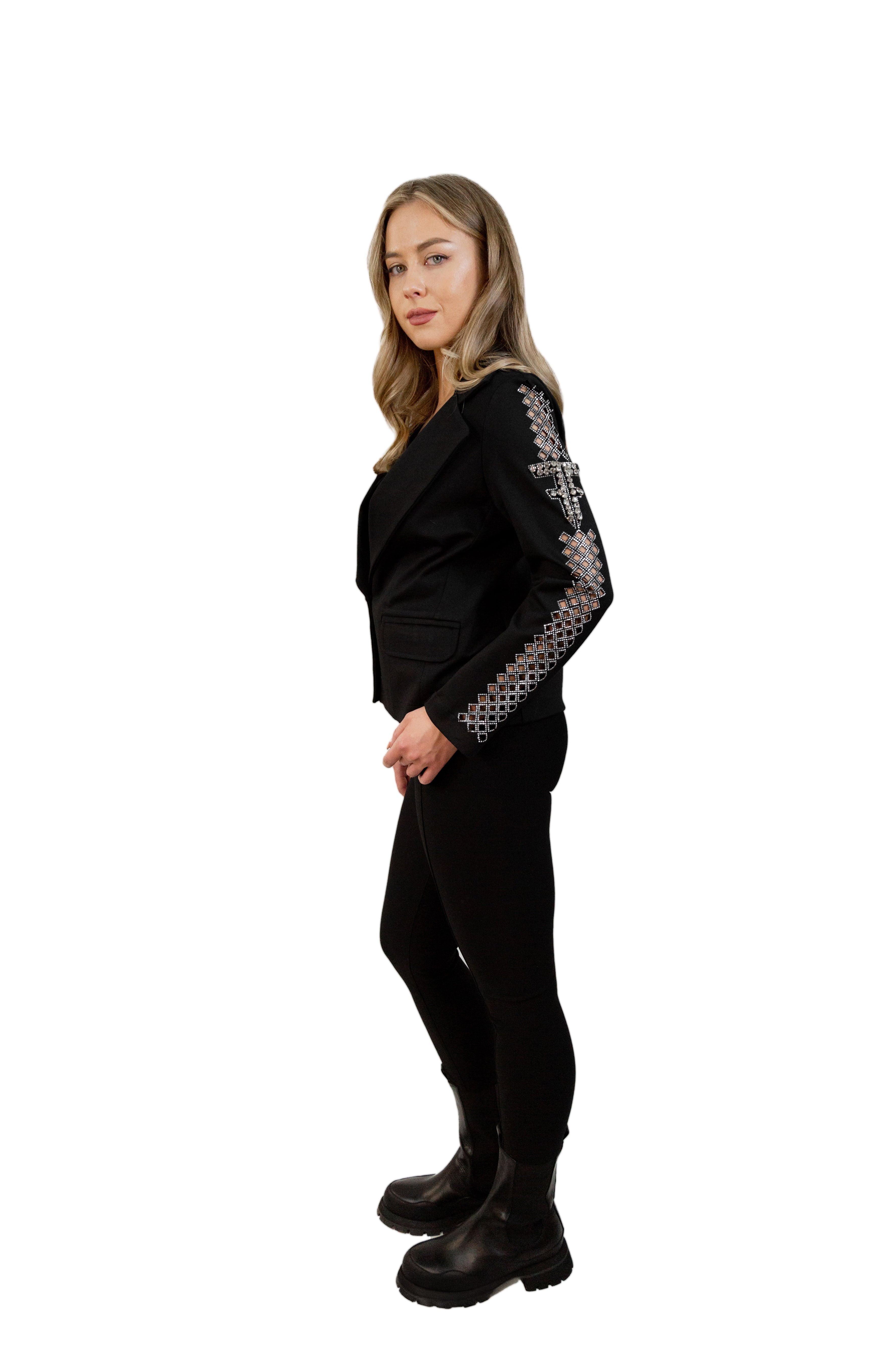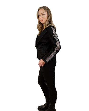 Este elegante blazer es ideal para cualquier ocasión. Con calado y hermosas aplicaciones, resalta tu estilo y le da un toque de sofisticación a tu look. Combínalo con cualquier outfit y siéntete segura de que siempre lucirás elegante y refinada.