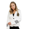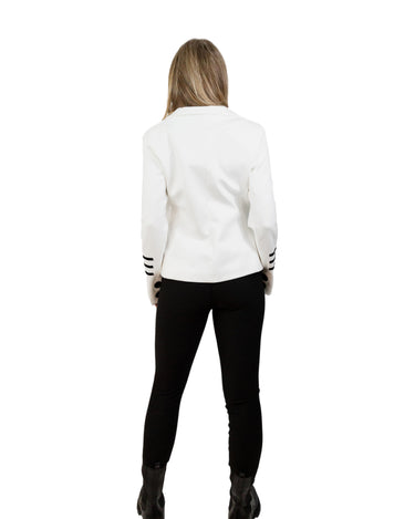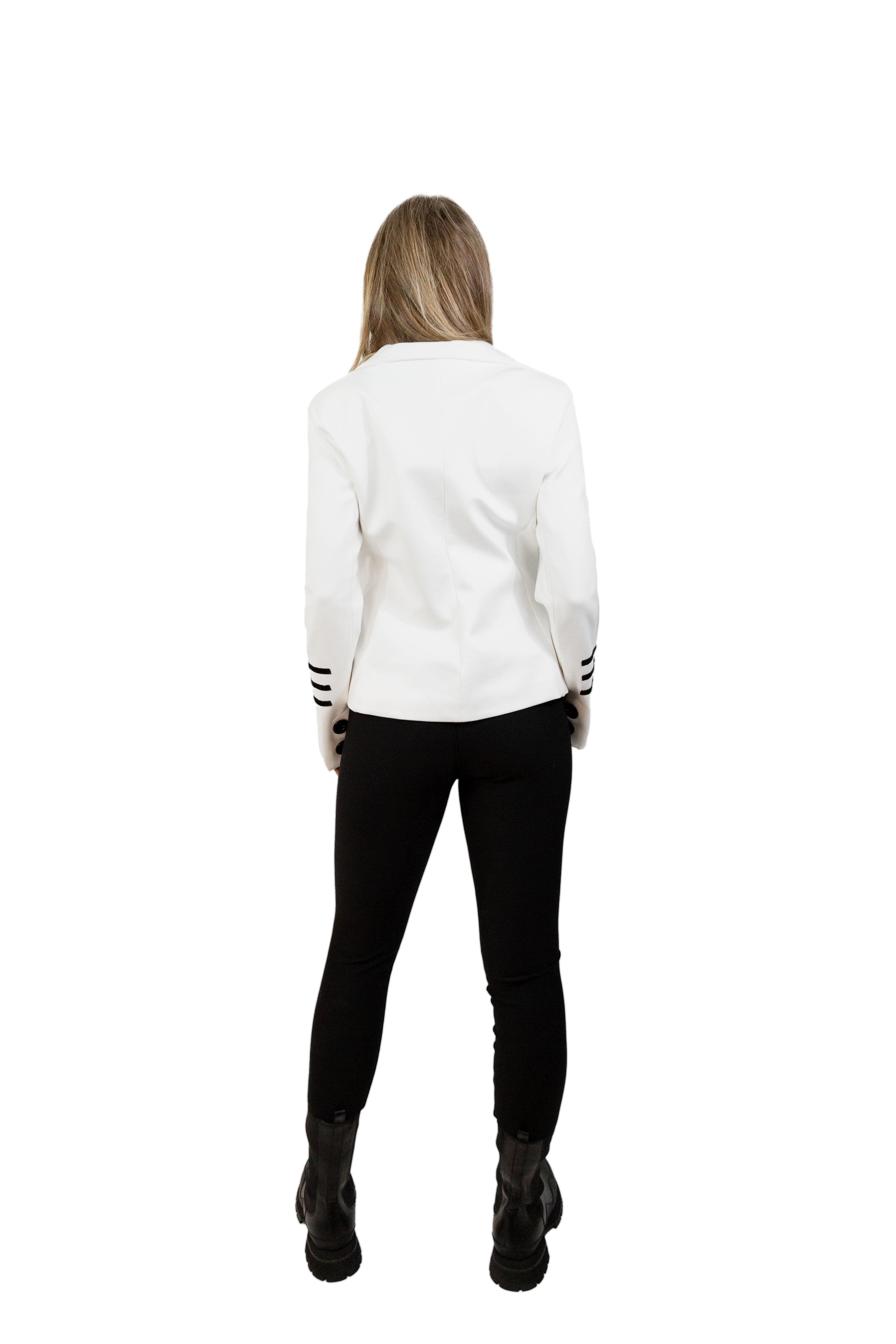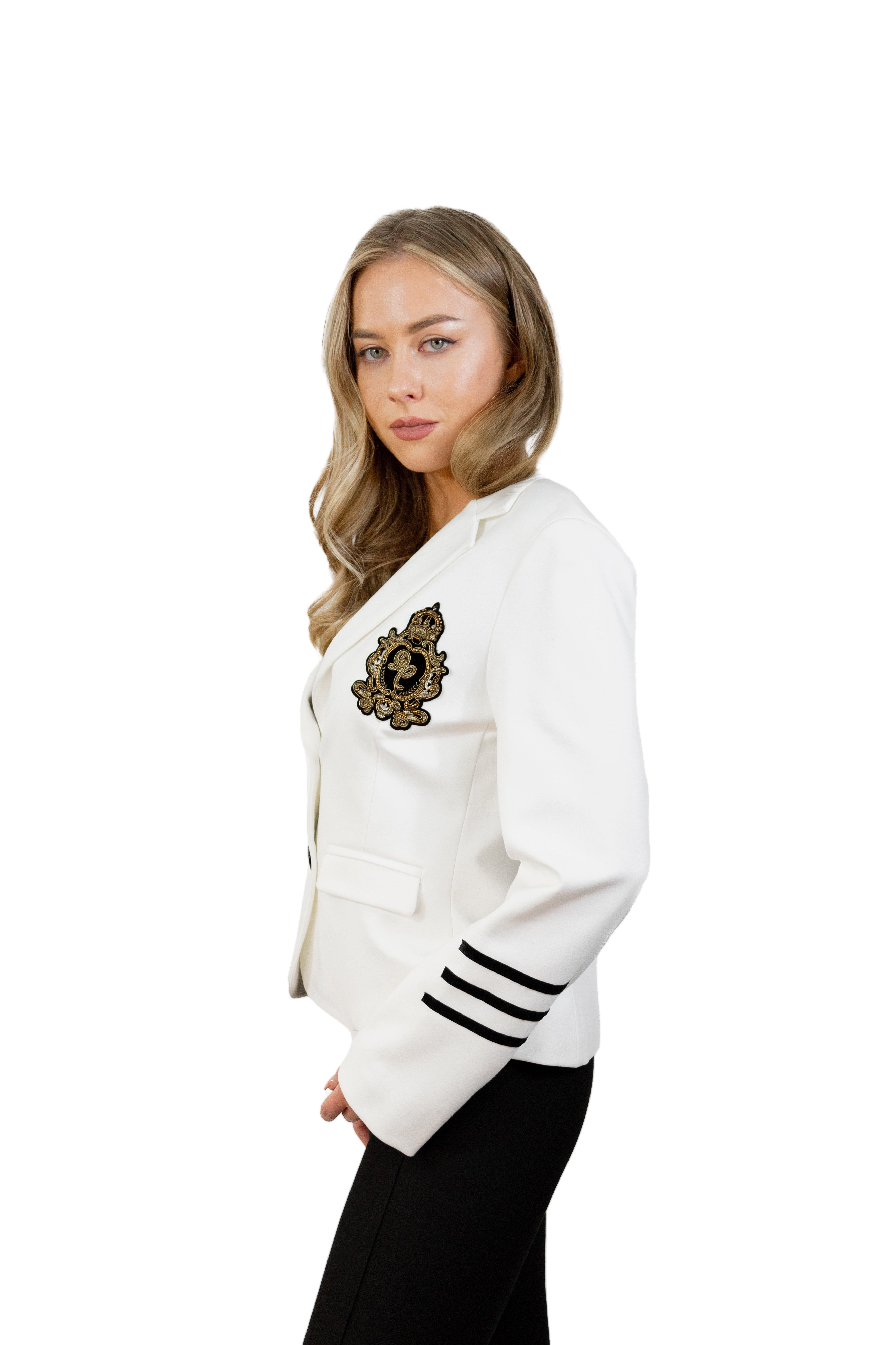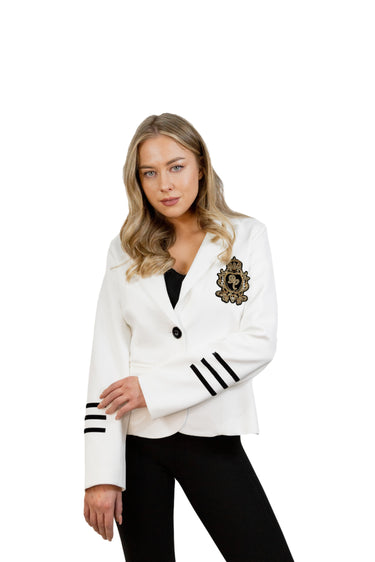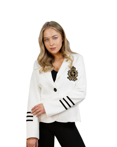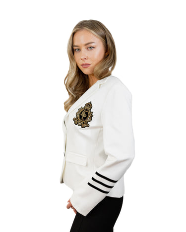 Este elegante blazer blanco está adornado con una aplicación bordada que lo hace destacar. Perfecto para cualquier ocasión, este blazer añade un toque de sofisticación y estilo a tu atuendo. Su diseño único y detallado te hará lucir elegante y a la moda.