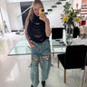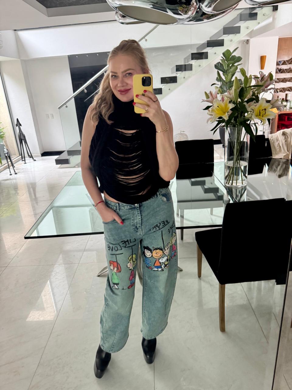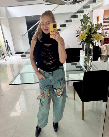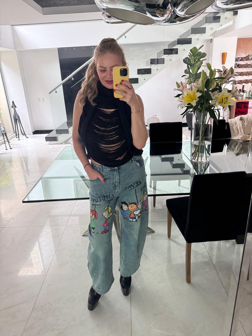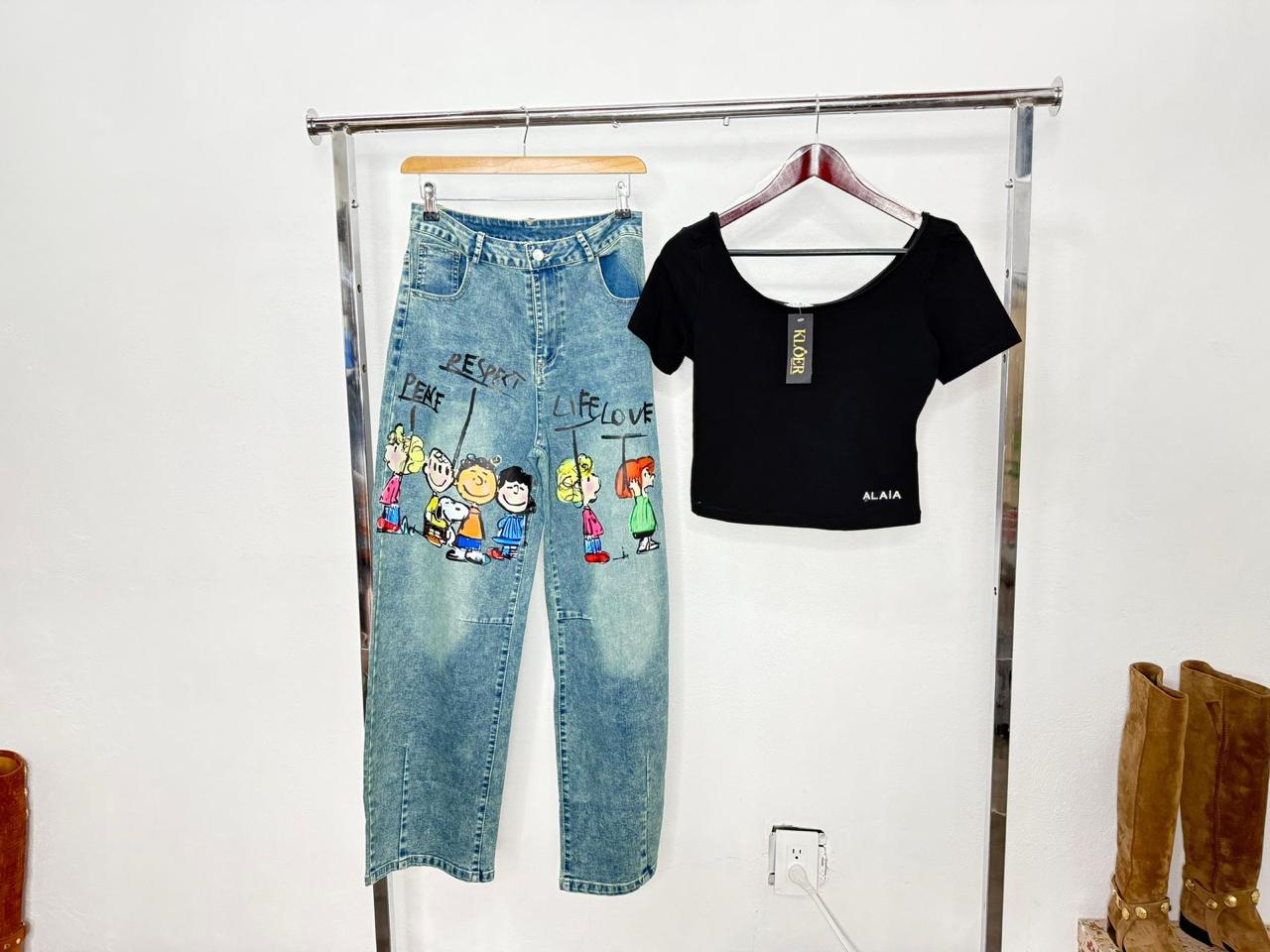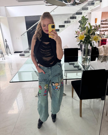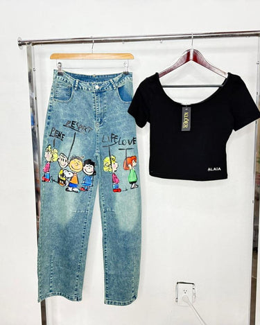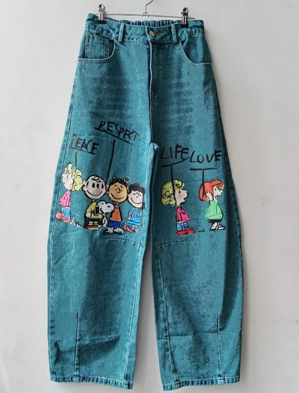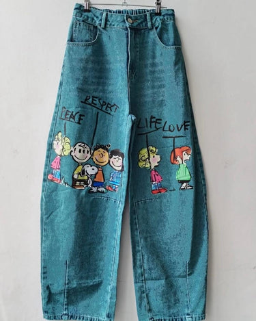PANTALON DE MEZCLILLA CON ESTAMPADO DE SNOOPY ESTILO OVERSIZE